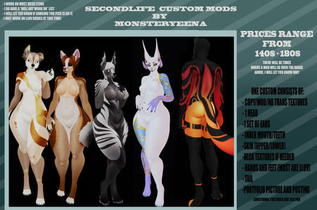 SL AVATAR MODS COMMISSIONS AND CHARACTER CREATION1) I will not copy someone else's character. I have a right to question if you do have ownership over a character if I suspect something is up!2) I require a reference sheet. I love to have visuals. It’s very difficult not having anything to work from.3) SL base skins have limitations. If something isn’t doable on your mod I will let you know. Please don’t freak out if a seam isn’t perfect. I will try to fix it to the best of my ability.4) Mods take some time to make. Please be patient AND polite. If not your mod may be pushed back or canceled entirely.5) When ordering a custom MOD you get: Head, Ears, Tail, Hands, Feet, and One body Textures and will be sent to 1 account. Any additional Textures or MOD sent to any other accounts will have an extra fee of 10$ Per.6) All Textures will be Copy/MOD/No Transfer7) After a MOD is commissioned I can not guarantee I will be keeping the files for a long period of time. With that said, if you happen to sell off the character I’m not obligated to be able to transfer the files to someone else. I apologize but the commissions are paid for the original purchaser. This is written this way due to characters being sold consistently and people reaching out for the MODs. Files eat up space and inventory. I do apologize.8) You are allowed 3 revisions to your mod when you get the product. Any further revisions will incur a charge. If it is my fault something is wrong. Make sure you give me exactly what you want to avoid this.. And a time frame of one week after delivery of the MOD.9) I’m more than willing to show examples and give quotes. Just ask.10) All other sections of my ToS apply to SL character modification as well.11) If you ask for a recommended list and don't wish to continue the commission. That 15$ fee for the recommended list is still due or your commission or your service will not continue or be pursued.9) I do not do any NSFW bits. I apologize :c12) These commissions are textures only and you must have mod skills in order to texture your parts. If you need help texturing I will offer help for a fee.13) If the mod is going to more than one account a fee may be added.14) I do not give out any PSD’s. These are proof of my hard work and dedication and they will not be handed out. Please do not ask.